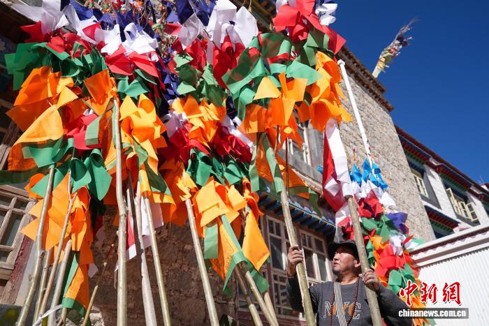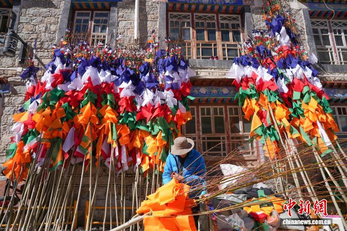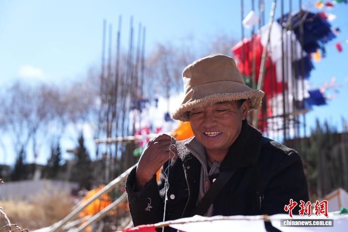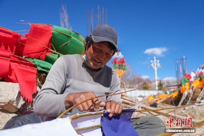 2月5日,臨近藏歷新年,在西藏自治區(qū)拉薩市街頭,農(nóng)牧民正縫制五彩經(jīng)幡樹(shù)。五彩經(jīng)幡樹(shù)是藏族民眾在藏歷新年前必備的年貨之一。藏歷新年期間,藏族民眾會(huì)選擇一個(gè)良辰吉日,為自家的房頂更換五彩經(jīng)幡樹(shù),祈求新的一年里五谷豐登,吉祥如意。