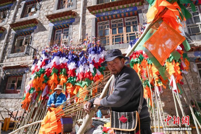 圖為來(lái)尼木縣的普瓊扛著五彩經(jīng)幡樹(shù)。貢確 攝
