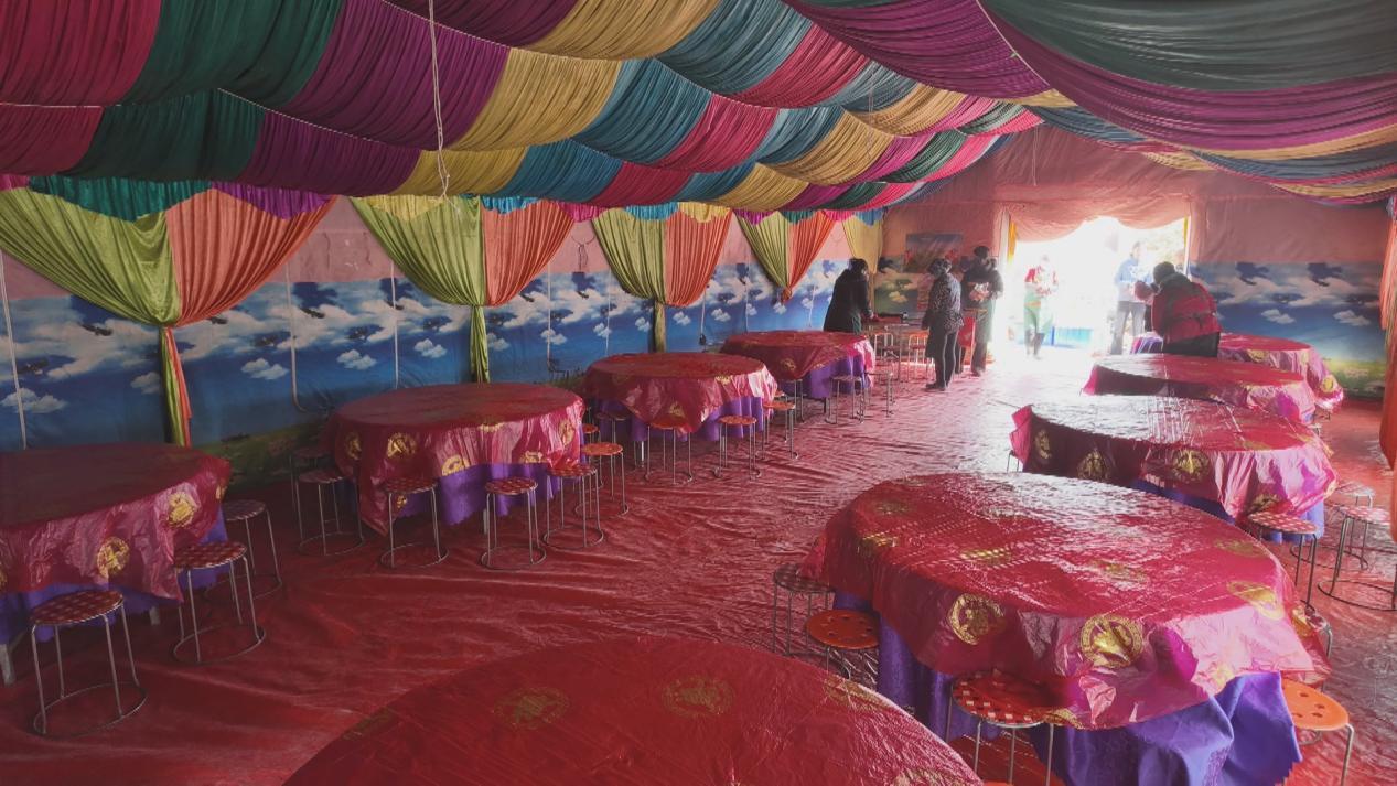 大家一起動手,不到半小時,一個大約一百平方米的移動帳篷宴會廳平地而起,配套的桌椅、桌布、取暖設備和照明電燈等一樣不少。鍋灶、煤氣爐、蒸箱一字排開,就在帳篷門口,真正“明廚亮灶”。備好了大件,大家開始洗青菜、擇菜,這些當天現(xiàn)弄才新鮮。