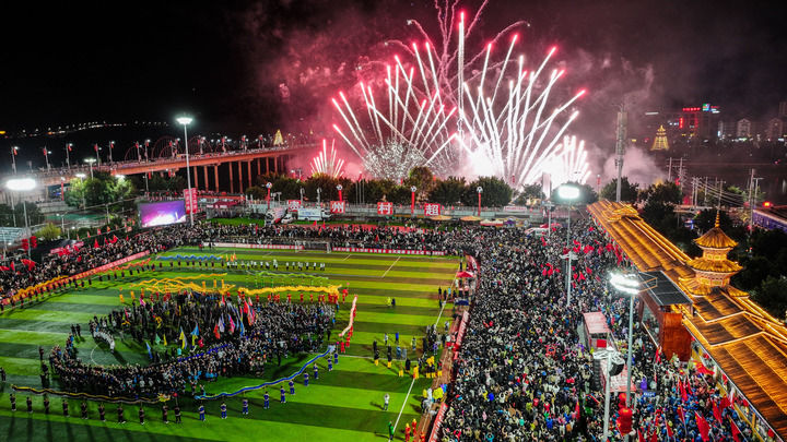 2024年2月3日,在貴州省榕江縣,2024全國(guó)“村晚”示范展示活動(dòng)暨貴州“村超村晚”舉行音樂(lè)煙花秀表演(無(wú)人機(jī)照片)。新華社記者 劉續(xù) 攝