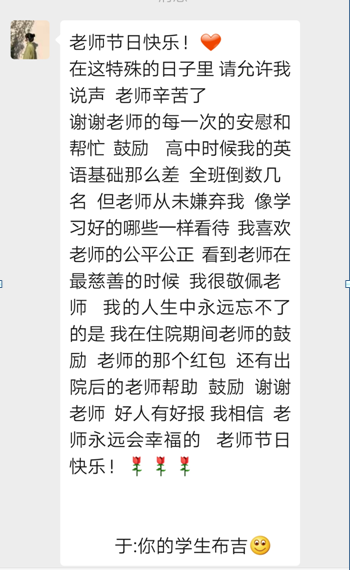 上大學時,?我?guī)е鴱哪抢飳W到的堅韌和自信,?踏入了這個全新的世界。?雖然大學生活與高中截然不同,?挑戰(zhàn)也更多,?但我始終記得您的教誨,?知道只要努力,?就沒有什么是不可能的。??每當遇到困難,?我都會告訴自己,?就像您曾經(jīng)幫助我克服英語難題一樣,?我也能在這里找到屬于自己的路,于是更加堅定了前進的決心。?
