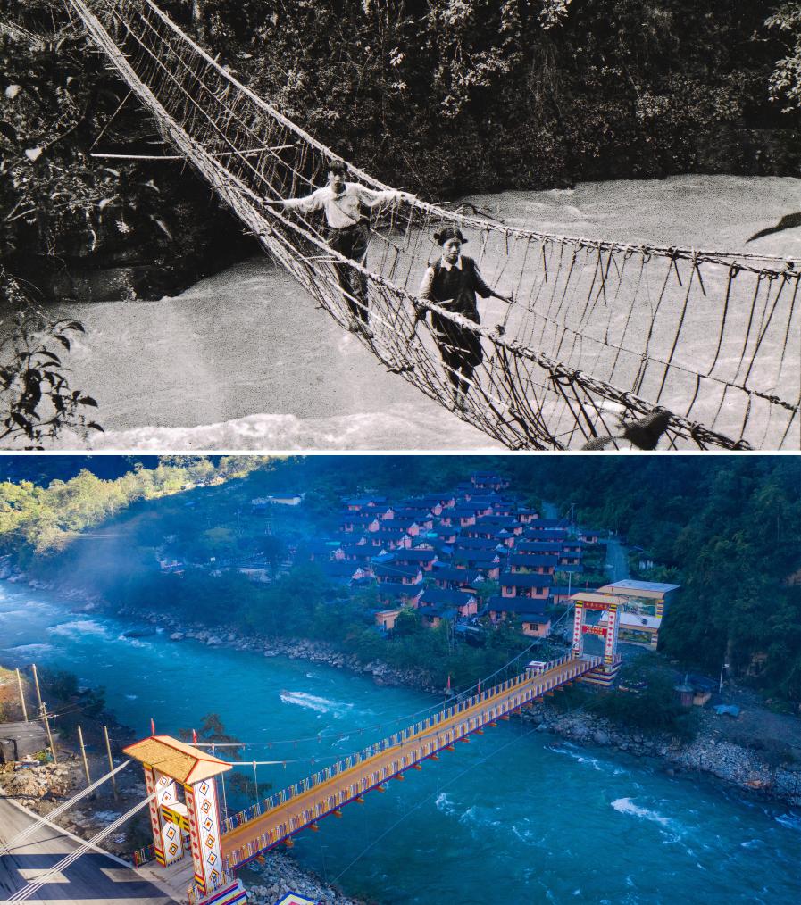 拼版照片:上圖為獨龍族群眾通過藤蔑橋(資料照片);下圖為獨龍江鄉(xiāng)白來感恩大橋(2020年10月29日攝,無人機照片,新華社記者胡超攝)。獨龍族是我國28個人口較少的民族之一,也是新中國成立初期從原始社會直接過渡到社會主義社會的少數(shù)民族,主要聚居在云南貢山獨龍族怒族自治縣獨龍江鄉(xiāng)。近年來,國家有關部門和云南省以整體推進的思路對獨龍江鄉(xiāng)進行集中幫扶,加速消除基礎設施、產(chǎn)業(yè)發(fā)展、人才素質(zhì)等“瓶頸”問題,使當?shù)亟?jīng)濟社會實現(xiàn)跨越式發(fā)展。2018年,獨龍族整族脫貧,實現(xiàn)“千年跨越”。
