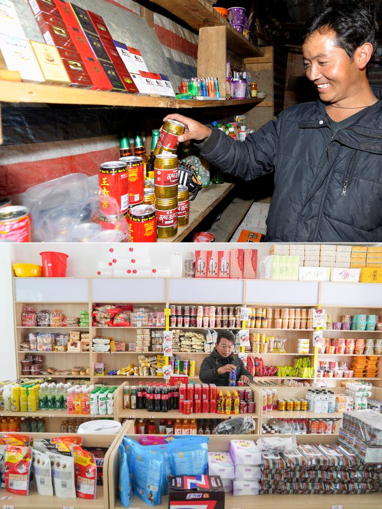 拼版照片:上圖為玉麥鄉(xiāng)一家商店的店主次旦扎西在擺放商品(新華社記者普布扎西攝,2009年9月9日攝);下圖為玉麥鄉(xiāng)一家超市的工作人員白瑪旺堆在店內(nèi)整理商品(新華社記者丁汀攝,2024年10月15日攝)。西藏自治區(qū)山南市隆子縣玉麥鄉(xiāng)地處喜馬拉雅山脈南麓。受惡劣自然條件影響,這里一度只有桑杰曲巴和女兒卓嘎、央宗三人居住,牢牢守在祖國邊境線上,這里也曾被稱為“三人鄉(xiāng)”。如今,曾經(jīng)的“三人鄉(xiāng)”已經(jīng)發(fā)展到67戶200多人,變成下轄兩個行政村的“小康鄉(xiāng)”。學校、衛(wèi)生院、游客接待中心等建筑物在這里拔地而起,不少村民用自家房屋開起了家庭旅館、小賣部、快遞站等……2023年,玉麥全鄉(xiāng)人均年收入超4萬元,人均居住面積達40平方米。如今的玉麥,迎來了“蝶變”。