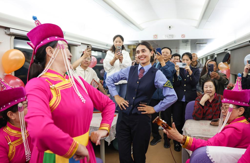 在由喀什開往成都西的列車上,塔吉克族列車長艾爾開牙·多力開與民間藝人一起跳舞(2024年4月19日攝)?;貞浫肼毥?jīng)歷,艾爾開牙·多力開說:“這是一次幸福的機遇。”2019年,為助力脫貧攻堅,鐵路部門在新疆喀什、和田等地招錄1000多名應屆畢業(yè)生。剛走出大學校門的艾爾開牙·多力開抱著試一試的心態(tài),帶著對遠方的憧憬,與鐵路結緣。在擔任列車員的四年時間里,艾爾開牙·多力開一步步成長,工作出勤、作業(yè)規(guī)范等考核都名列前茅。2023年下半年,她以優(yōu)異成績通過系列綜合測評,成為我國首位塔吉克族列車長。新華社記者 胡虎虎 攝