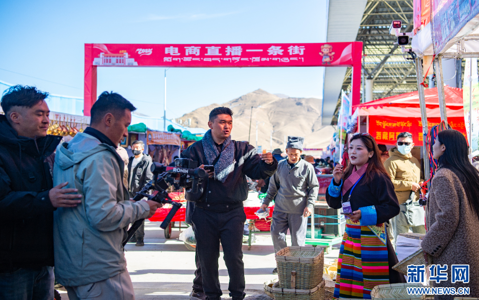 12月1日,一位電商主播在西藏自治區(qū)山南市第45屆雅礱物資交流會(huì)現(xiàn)場介紹產(chǎn)品。新華網(wǎng) 旦增努布 攝