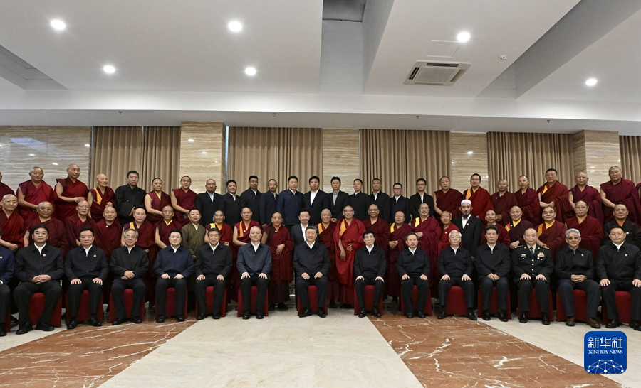 8月20日下午,中共中央總書記、國(guó)家主席、中央軍委主席習(xí)近平在拉薩親切接見西藏自治區(qū)宗教界愛國(guó)人士和寺管會(huì)干部代表,并同大家合影留念。新華社記者 李響 攝