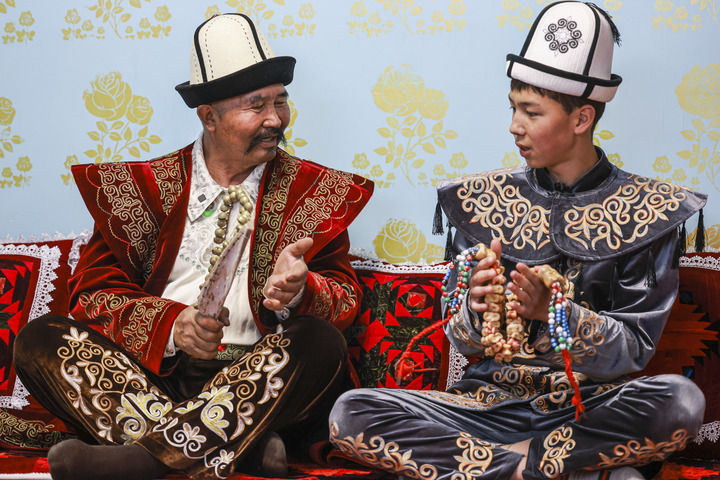 《瑪納斯》國(guó)家級(jí)非物質(zhì)文化遺產(chǎn)代表性傳承人江努日·圖日干巴依(左)教徒弟演唱《瑪納斯》(2025年4月21日攝)。新華社記者 王菲 攝