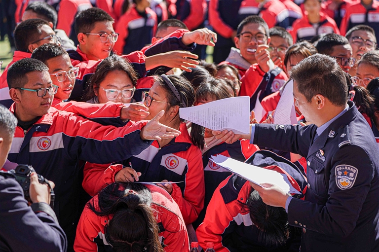 西藏“開學(xué)第一課”網(wǎng)絡(luò)普法進(jìn)校園活動(dòng)中,民警為學(xué)生發(fā)放普法宣傳知識(shí)手冊(cè)。記者 貢曲羅杰 攝
