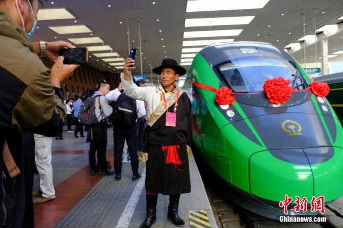 資料圖:民眾在拉薩火車站復(fù)興號車頭前拍照留念。 中新社記者 江飛波 攝