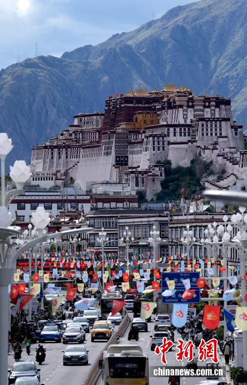 8月19日,隨著西藏自治區(qū)成立60周年慶?;顒优R近,拉薩氛圍濃。圖為拉薩街頭彩旗飄揚。中新社記者 李林 攝