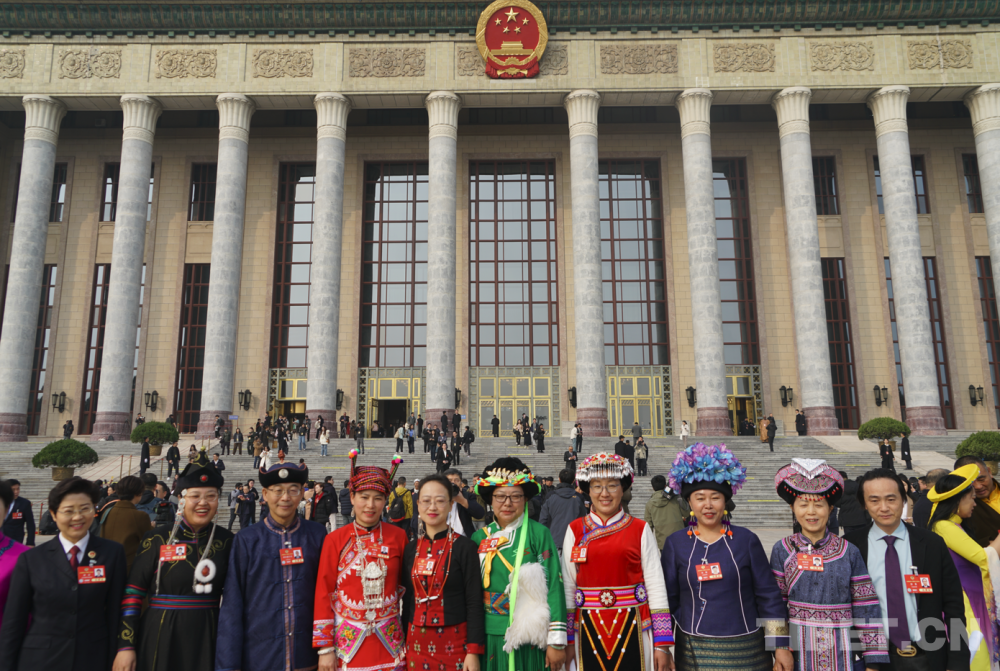 圖為閉幕會(huì)后,委員們?cè)谌嗣翊髸?huì)堂前合影 攝影:楊眉笑