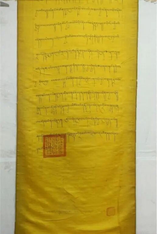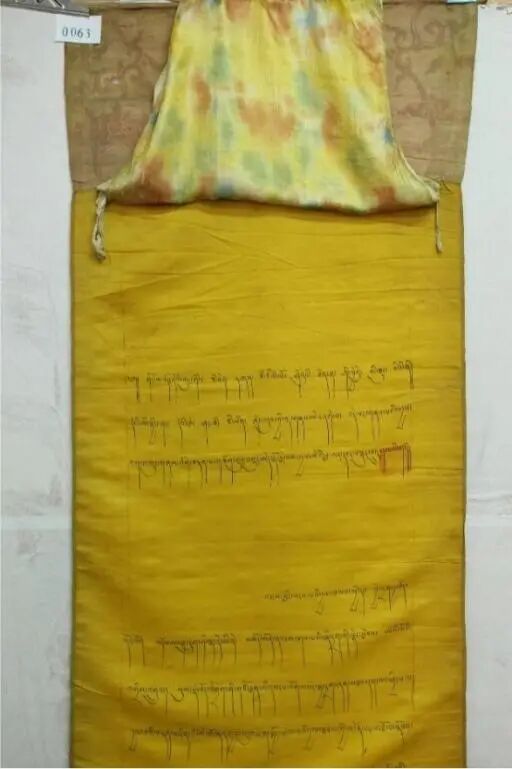 第四件文告發(fā)布于1698年(藏歷土虎年)(圖四),該文告是一件長達137厘米的黃色絲綢長卷,其起首格式同樣具有重大政治意涵:“奉皇帝圣旨,在霍爾領土之上第六世達賴喇嘛金剛持頒布的法旨”。這句話言簡意賅,卻構(gòu)成了一個完整的權(quán)力敘事閉環(huán):皇帝的旨意是最高權(quán)威來源,達賴喇嘛的教令是在當時清朝管轄下的和碩特蒙古勢力范圍(霍爾領土)內(nèi)行使。