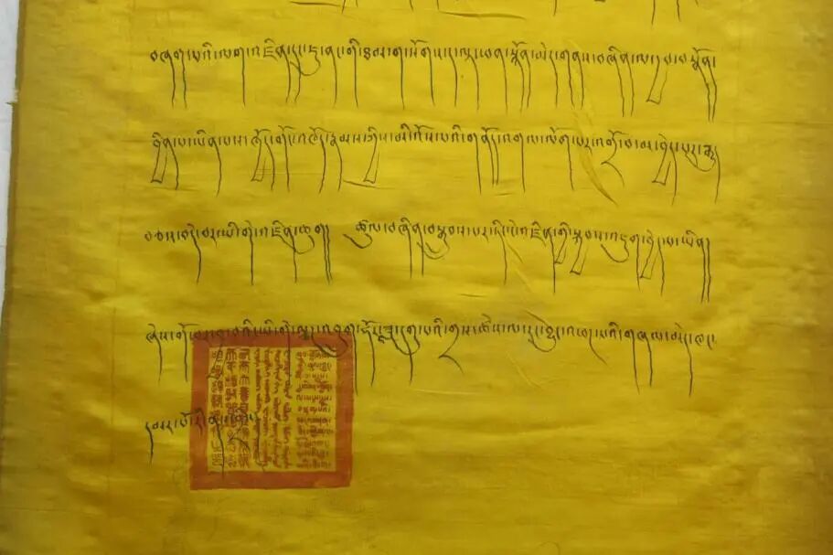 西藏博物館收藏著一份六世達賴喇嘛發(fā)布的文告(圖一)。這份發(fā)布于1700年(藏歷鐵龍年)的文件,書寫于黃色絲綢上,裝裱華麗如唐卡。