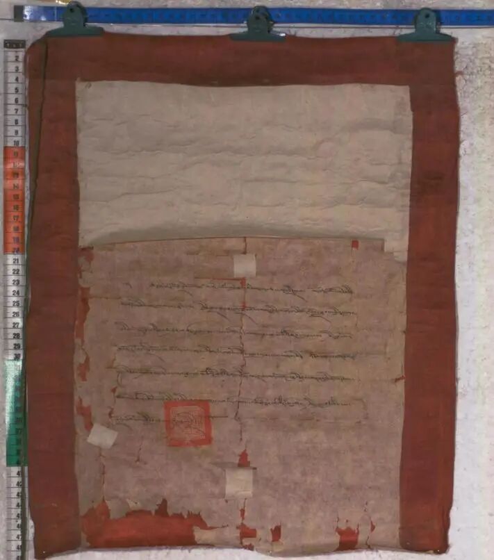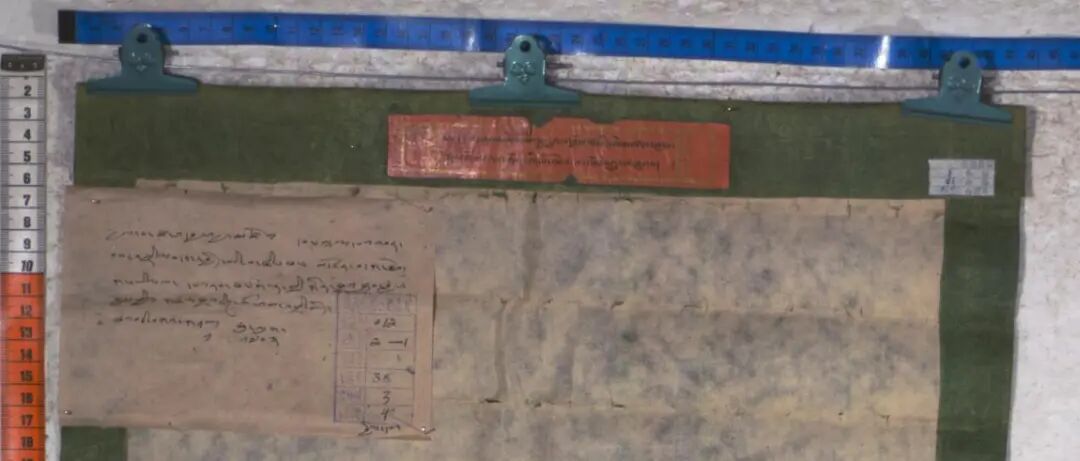 1703年文告中提到“先前有加蓋第司·桑杰嘉措印章之五世達賴文告”,末尾落款“水羊年寫于布達拉宮大殿”。文告正上方貼有紅色紙簽,藏文粗體書寫“尊者第六輩仁波切洛桑仁欽倉央嘉措之文告”;左上方附有的白色紙片亦明確寫有“尊者倉央嘉措曉諭汪丹貝娃瓦所擁有的土地、田產(chǎn)和房產(chǎn)及多熱中應收取的差稅如畜力和實物差稅”等內(nèi)容。