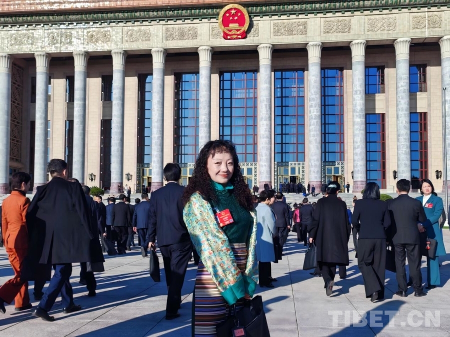 今年全國(guó)兩會(huì)期間,全國(guó)人大代表、西藏自治區(qū)社會(huì)科學(xué)院研究員白瑪措在人民大會(huì)堂前留影 受訪者供圖