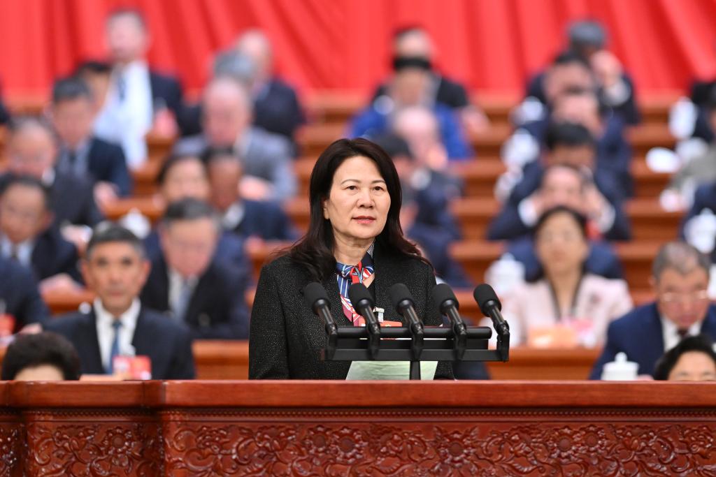 3月7日,全國政協(xié)十四屆四次會議在北京人民大會堂舉行第二次全體會議。這是霍金花委員代表民盟中央作題為《夯實底層技術 加快建設制造強國》的發(fā)言。新華社記者 劉衛(wèi)兵 攝