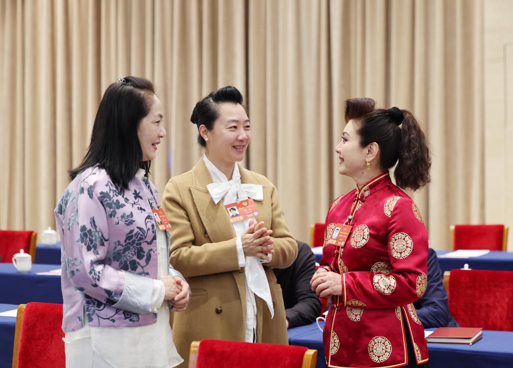 3月6日,全國(guó)政協(xié)委員迪麗娜爾·阿布拉(右)、周利(中)和苗潔在文化藝術(shù)、體育界委員聯(lián)組會(huì)前交流。新華社記者 姚大偉 攝
