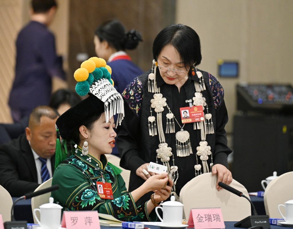 3月7日,金瑞瑞代表(前左)在十四屆全國(guó)人大四次會(huì)議云南代表團(tuán)開放團(tuán)組會(huì)議前與另一位代表交流。新華社記者 程婷婷 攝