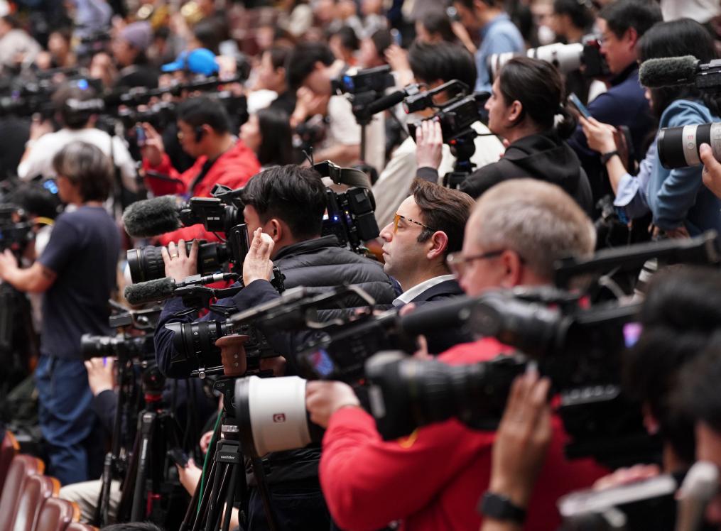 3月12日,十四屆全國人大四次會議在北京人民大會堂舉行閉幕會。這是記者在閉幕會上采訪。新華社記者 傅天 攝