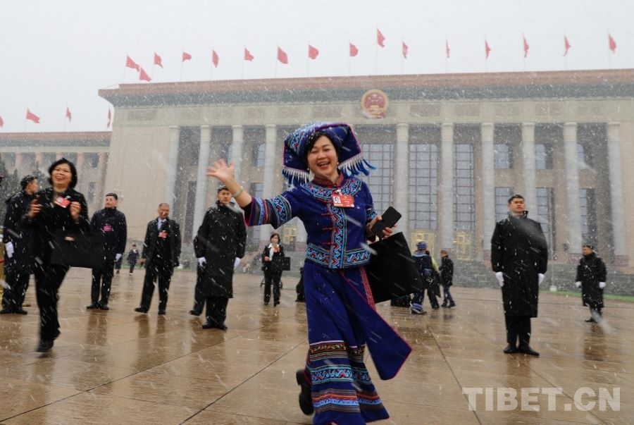 3月4日上午,十四屆全國人大四次會議舉行預(yù)備會議。會后,一場春雪不期而至。走出會場的全國人大代表、廣西金秀瑤族自治縣桐木中學(xué)副校長梁麗斌向記者們揮手致意。