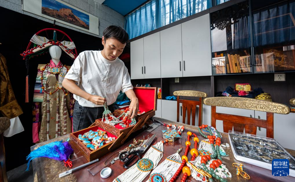 班珠丹塔在家中工作室內(nèi)整理自己做的藏式配件(9月11日攝)。新華社記者 丁增尼達(dá) 攝?