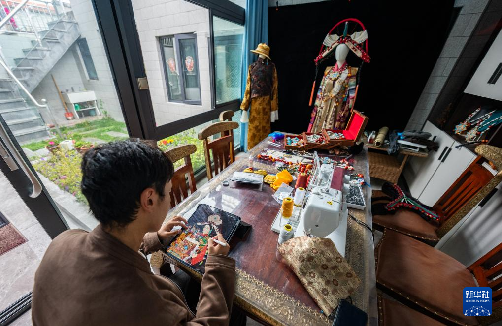 班珠丹塔在家中工作室設(shè)計(jì)藏裝(9月11日攝)。新華社記者 丁增尼達(dá) 攝?