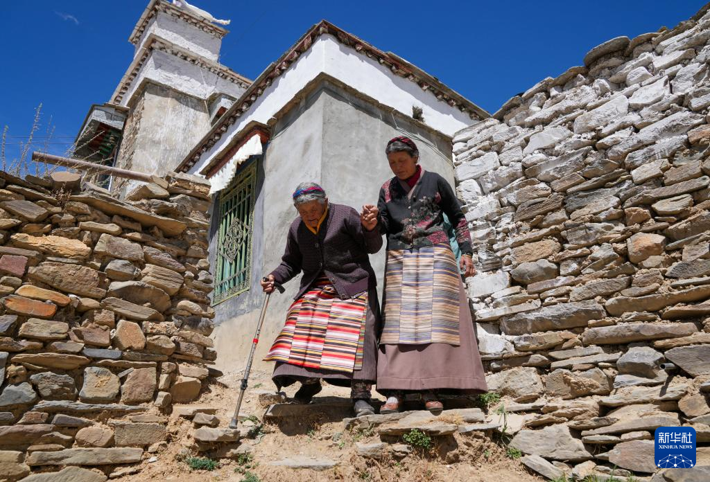 次仁桑姆(中)和兩位晚輩在宗卡村家中的院子里聊天(3月26日攝)。新華社記者 晉美多吉 攝