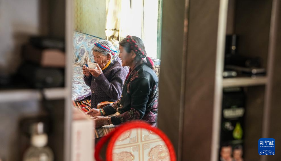 次仁桑姆(中)和兩位晚輩在宗卡村家中的院子里聊天(3月26日攝)。新華社記者 丁增尼達(dá) 攝