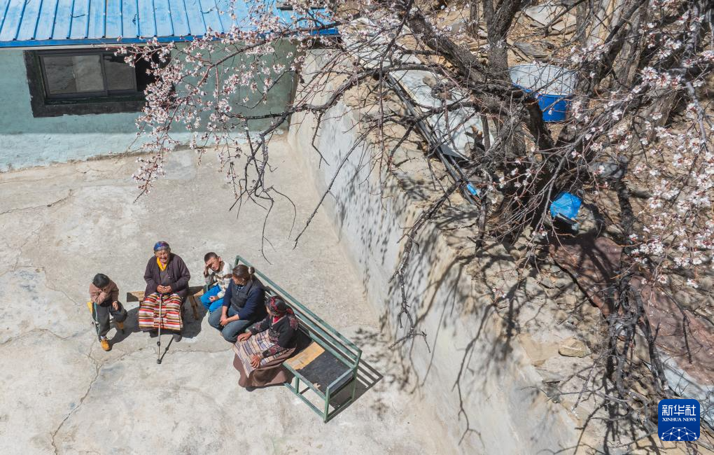 3月26日,次仁桑姆(左二)和晚輩在宗卡村家中的院子里聊天(無(wú)人機(jī)照片)。新華社記者 丁增尼達(dá) 攝